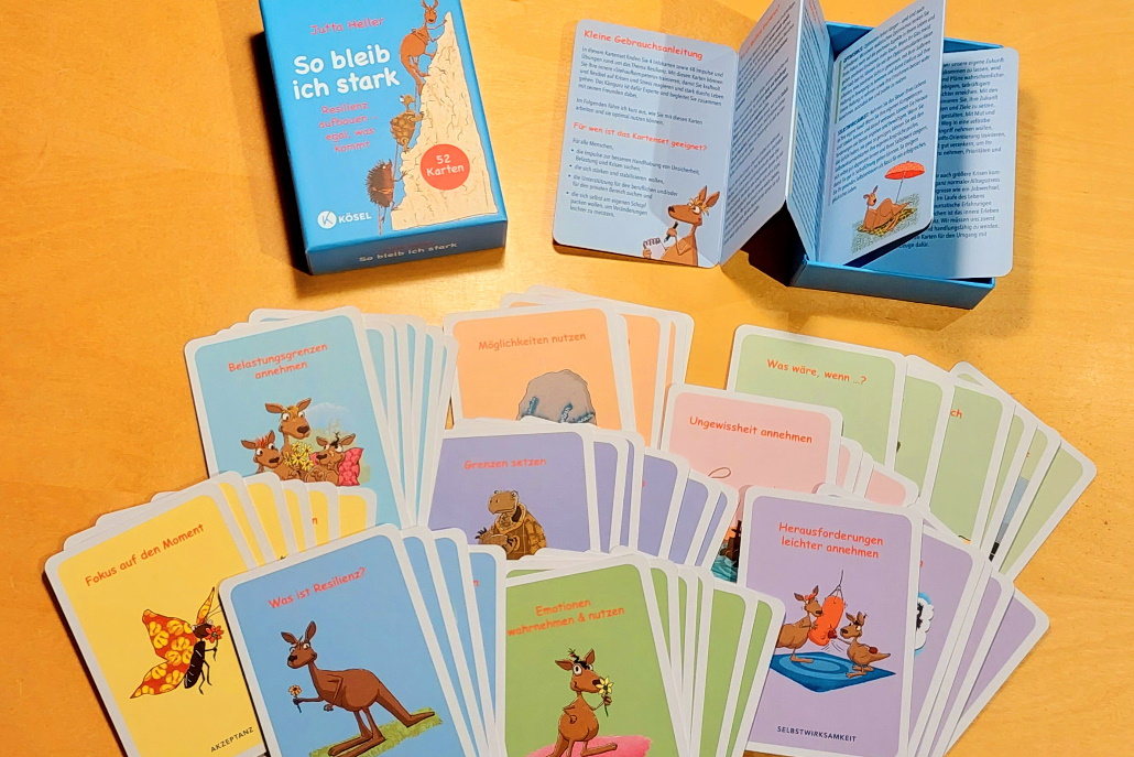 Resilienz lässt sich mit unterschiedlichen Maßnahmen gezielt fördern, im Gruppentraining oder im Einzelcoaching, autodidaktisch mit Selbstlernkursen oder in Webinaren. Mit dem Kartenset „So bleib ich stark“ entwickelte Resilienzexpertin Prof. Dr. Jutta Heller nun einen neuen, spielerischen Ansatz: 48 Karten bieten zahlreiche Impulse, aufgeteilt in die 7 Resilienz-Schlüssel plus den Bereich „Umgang mit Krisen“.