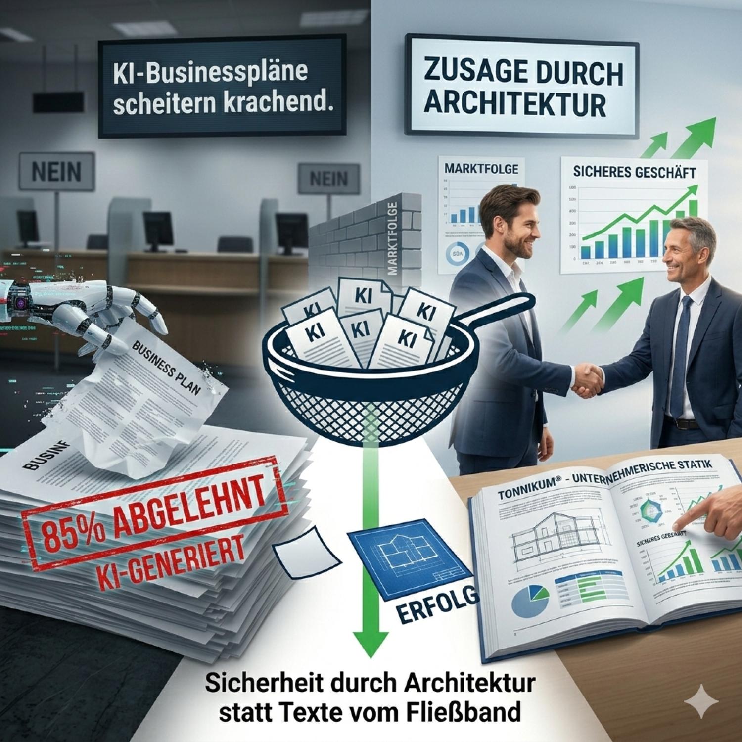 Sicherheit durch Architektur statt Texte vom Fließband Das TONNIKUM® begegnet der KI-Schwemme mit Andersartigkeit. Während der Markt mit Vorlagen geflutet wird, liefert Tonn eine unternehmerische Statik, die exakt auf die unsichtbaren Prüfer der Marktfolge zugeschnitten ist. Fokus ist die Souveränität der Liquidität: Wie belastbar ist das Gründerprofil, wenn der Rückwärts-Check vom dritten Jahr zum ersten Monat erfolgt?