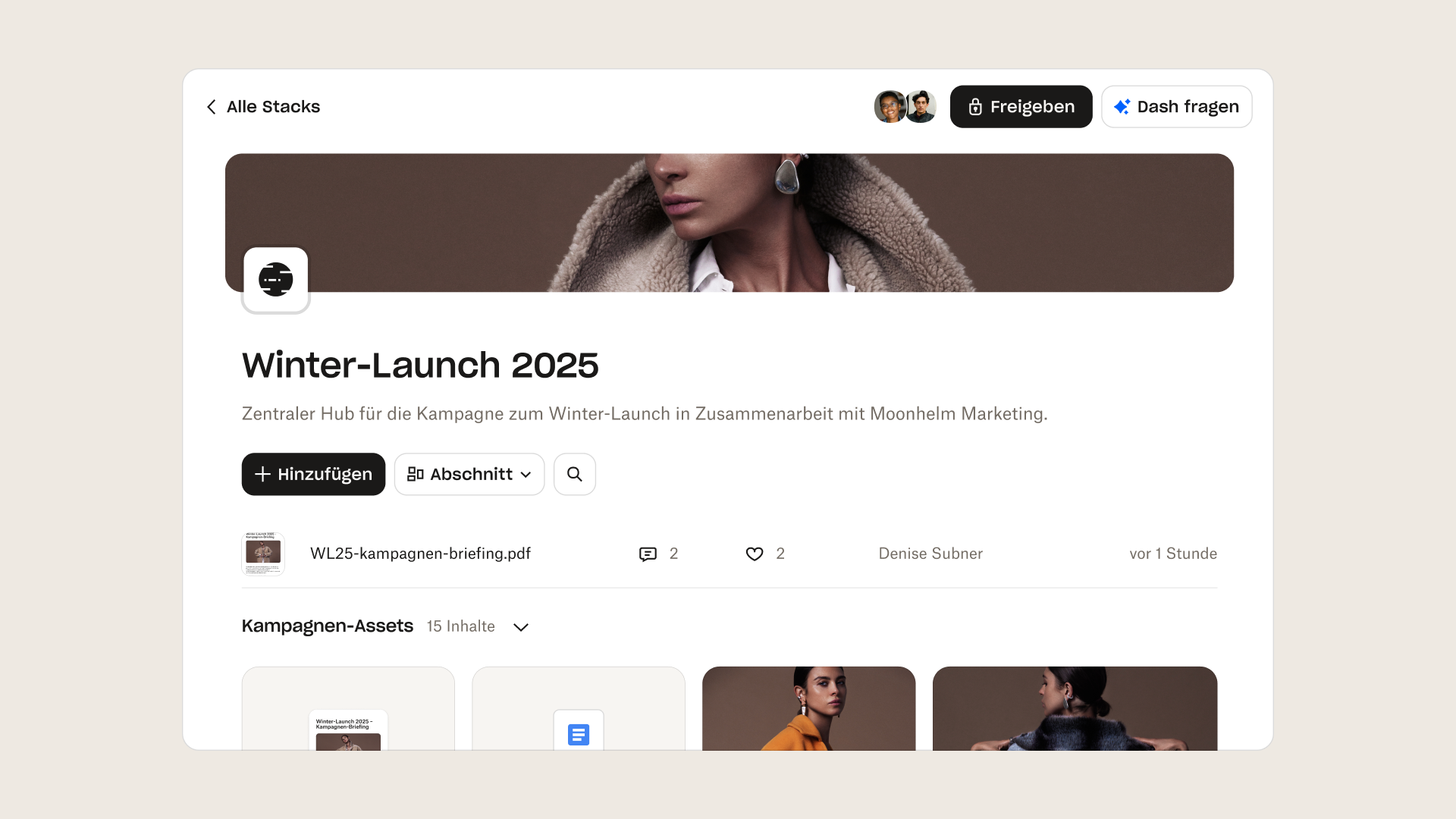 • Mit “Stacks” auf dem Laufendem bleiben: Der lebendige Arbeitsbereich erleichtert das Organisieren und Teilen von Inhalten. Dateien, Links und Aktualisierungen können in einer Ansicht für das gesamte Team zusammengeführt werden, die so immer auf dem neuesten Stand sind. Darüber hinaus können Mitarbeitende auch Fragen stellen und erhalten Antworten, die sich speziell auf diesen Stack beziehen.