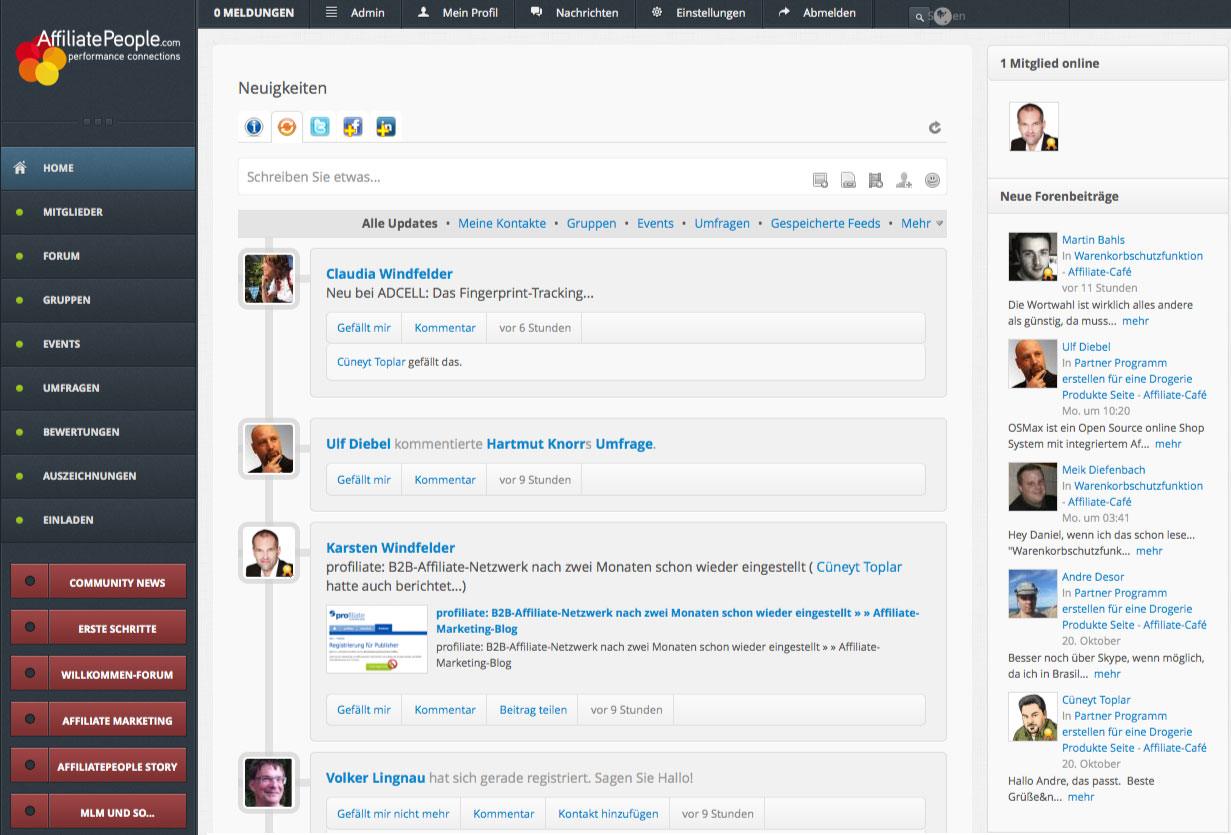 Für Betreiber von Webseiten, Partnerprogrammbetreiber und Mitarbeiter von Agenturen und Affiliate-Netzwerken sind Kontakte in der Affiliate-Szene besonders wichtig. Die Branchen-Community Affiliate People bietet dabei gute Möglichkeiten, sich innerhalb der Szene zu vernetzen.