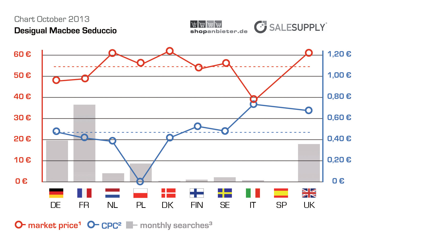 München/Duisburg, 22.10.2013: Initiiert von Salesupply und shopanbieter.de erscheint monatlich der internationale Preisindex. Dieser zeigt bei verschiedenen Produkten regelmäßig deutlich unterschiedliche Marktpotentiale im europäischen E-Commerce auf. Auch im Oktober belegt der aktuelle Marktvergleich teilweise deutlich höhere erzielbare Erlöse. In manchen Fällen können die Unterschiede gravierend sein. In Polen erzielt bspw. eine Markenhandtasche der Firma Desigual, nach Abzug der Marketingkosten, sogar einen um über 75 Prozent höheren Erlös als in Deutschland.