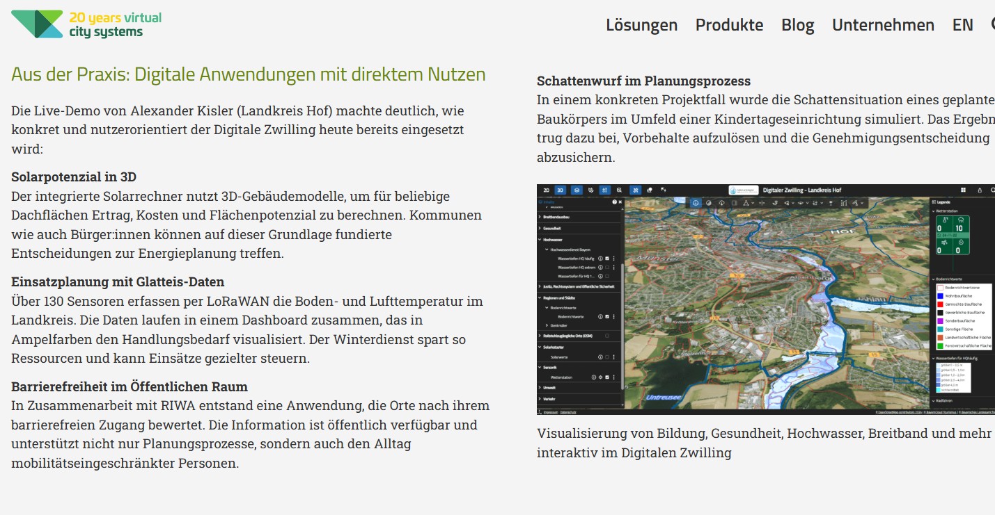 München, 18. Februar 2026 – Wie können Smart-City Plattformen optimal aufgebaut werden, und wie können Landkreise, Städte und Gemeinden davon profitieren? Das haben Fachleute des Landkreises Hof zusammen mit Virtual City Systems (VCS), dem Daten-Kompetenzzentrum für Städte und Regionen (DKSR) und RIWA in der Veranstaltung „hoferLand.digital im Gespräch“ gezeigt. Über 170 Teilnehmerinnen und Teilnehmer von Kommunen aus ganz Deutschland waren online dabei und haben sich über den Digitalen Zwilling als Herzstück für eine optimierte Planung, Verwaltung und Kommunikation einer interkommunalen Zusammenarbeit informiert. Insgesamt sind im Smart-City-Projekt „hoferLand.digital“ 27 Kommunen auf einer Plattform organisiert.