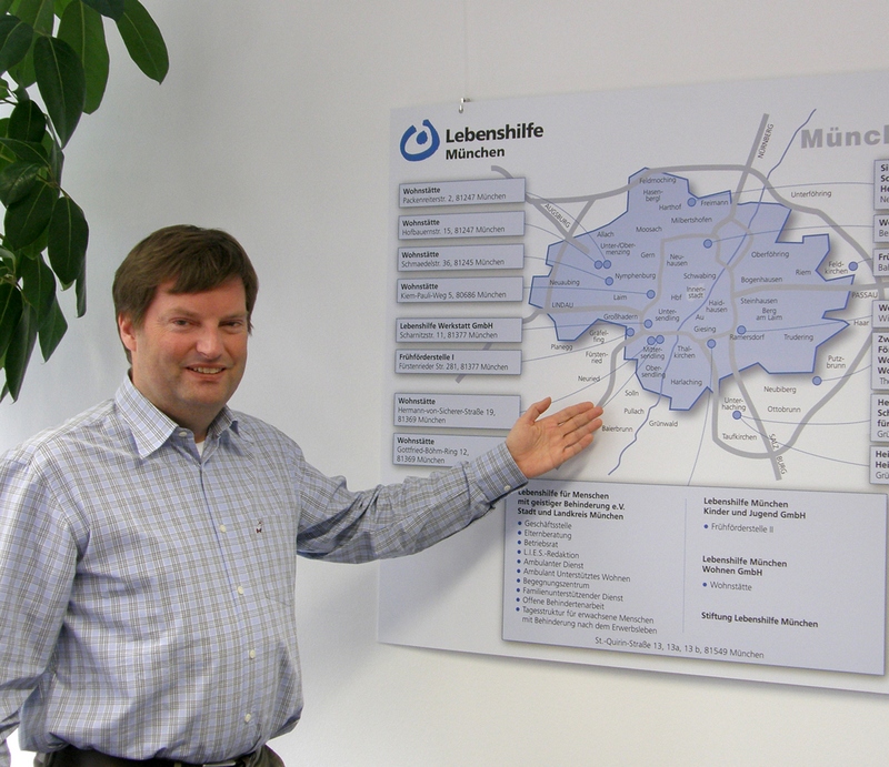 Damit gibt er der Lebenshilfe München neue Impulse in der konsequenten Weiterentwicklung und Förderung von Menschen mit geistiger Behinderung. Denn schon seit den frühen 80er Jahren hat die Lebenshilfe München mit ihren Wohnstätten auf Inklusion gesetzt, wenngleich dieser Begriff damals unbekannt war. Ansinnen des Vereins war es, kleine Wohnstätten in reinen Wohngebieten der Stadt München zu führen. Heute bestehen elf Stadthäuser und Wohnprojekte, die für Außenstehende nur schwer als Heimeinrichtung zu erkennen sind. Sie fördern die Selbständigkeit der Bewohner, im Fachjargon spricht man von Trainingszentren und Übergangseinrichtungen in ambulanten Wohnformen, Lebenshilfe München im Wandel.
